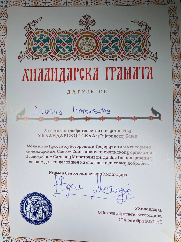 Подсећамо јавност да је председник Праве Србије, Душан Марковић пре пар месеци добио ХИЛАНДАРСКУ грамату за исказано добротворство при устројењу ХИЛАНДАРСКОГ СЕЛА у Сијаринској Бањи коју му је уручио управо игуман манастира Хиландар, отац Методије.