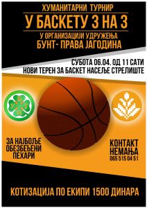 Хуманитарни турнир у баскету 3 на 3 у организацији БУНТ – Праве Јагодине одржаће се у суботу 06. априла 2019. године на новом терену у насељу Стрелиште са почетком у 11 часова.