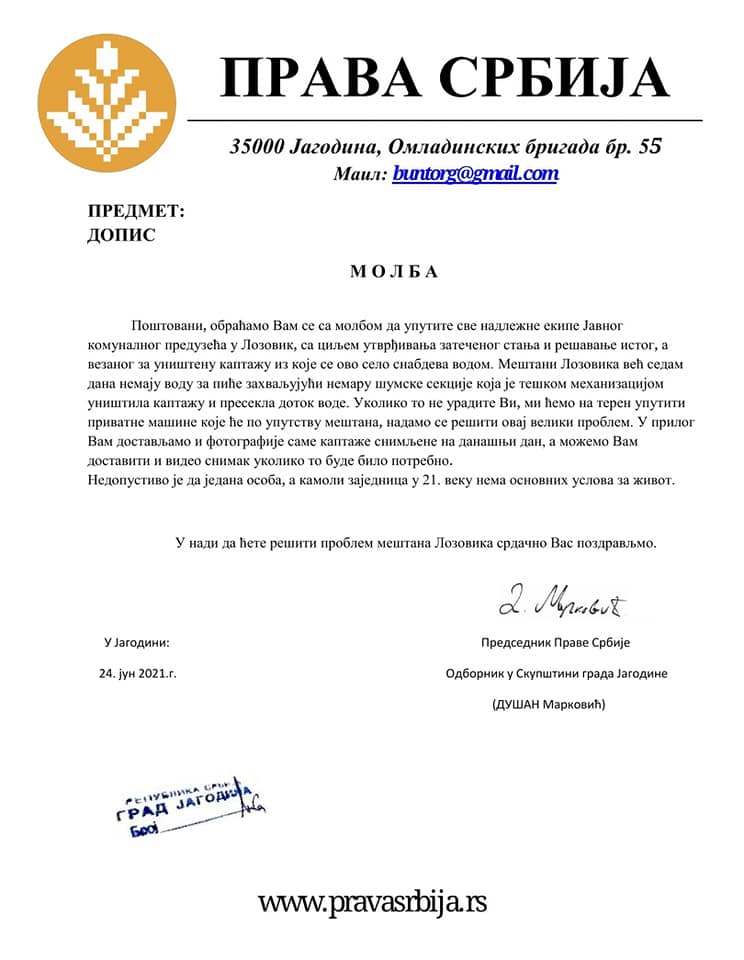 Наша политичка партија захваљује се институцијама које су нам дале обећање да ће решити проблем, а које су данас кренуле у реализацију отклањања квара на каптажи у Лозовику, али не можемо бити задовољни брзином њихове интервенције обзиром да смо молбу за отклањање квара послали пре нешто више од месец дана.